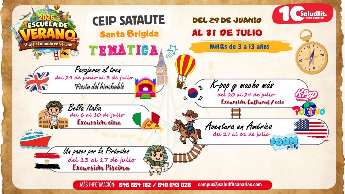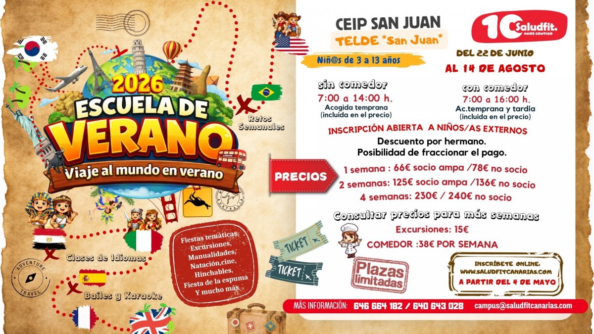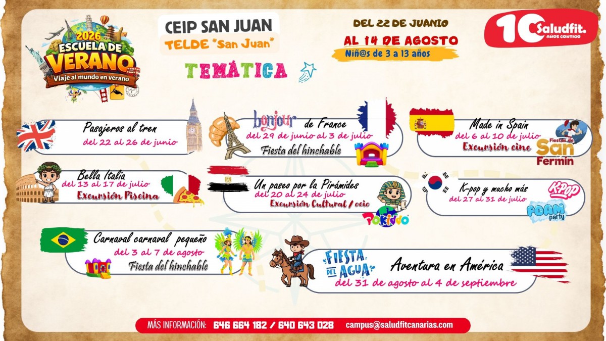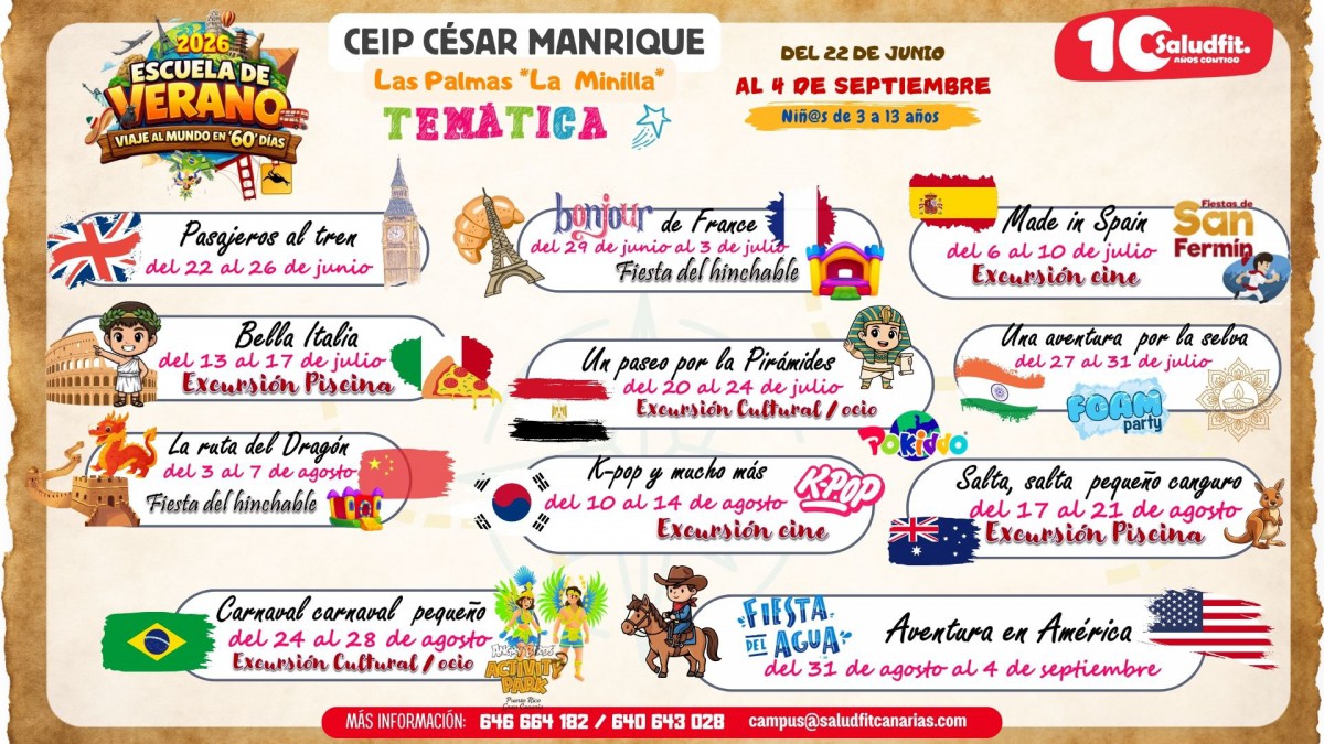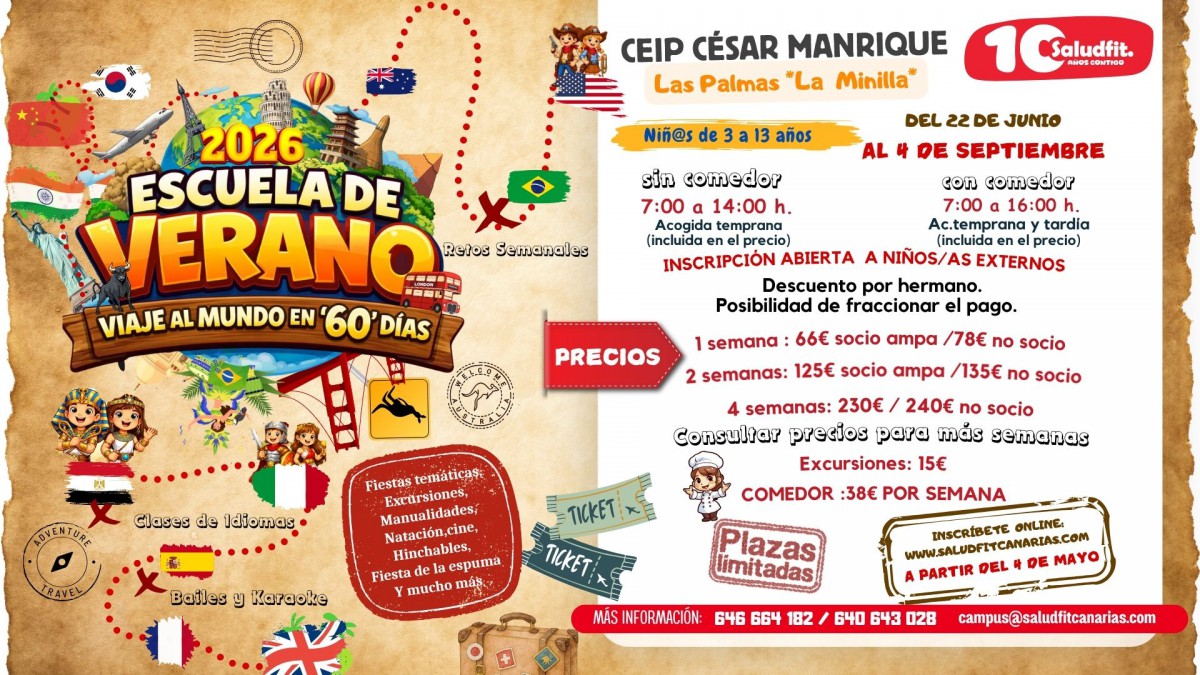 Los AMPAS del Ceip César Manrique, Juan del Río Ayala y Ceip San Juan en colaboración con Saludfit Canarias organiza El campus de Verano, Navidad y Semana Santa de 2025 , para que las familias puedan conciliar la vida laboral durante el periodo estival e incluye nuevas actividades para el disfrute de los niños de 3 a 12 años.