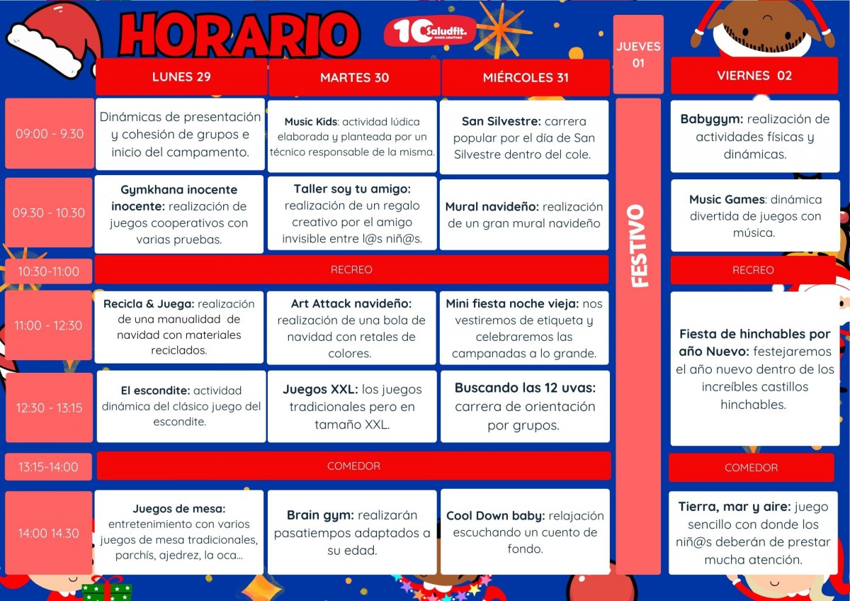 - El horario del Campus será de 7:00 h a 15:30 horas de lunes a viernes. La recogida temprana se realizará de 7:00 h a 9:00 h, y a partir de las 9:00 h, seguiremos el horario tipo . El horario de salida será de 13:30 a 14:00 h para los que no tengan comedor y de 14:45 -15:00h .Para los niños/as que se acojan comedor.